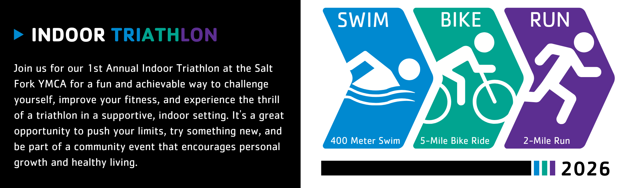 Get ready to challenge yourself and be part of an exciting, community-focused event! The Salt Fork YMCA is proud to host its first Annual Indoor Triathlon, a fun and supportive competition designed for participants of all fitness levels. Whether you’re a seasoned athlete or new to triathlons, this event is an opportunity to push your limits in a welcoming, encouraging environment.